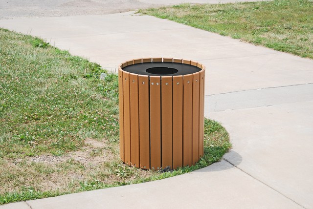 Made with twenty-four 1" x 4" Resinwood slats. The only receptacle on the market with completely maintenance-free molded plastic rings. Heavy duty zinc coated hardware available. Liner sold separately. Dome lids with hinged door available for additional cost.